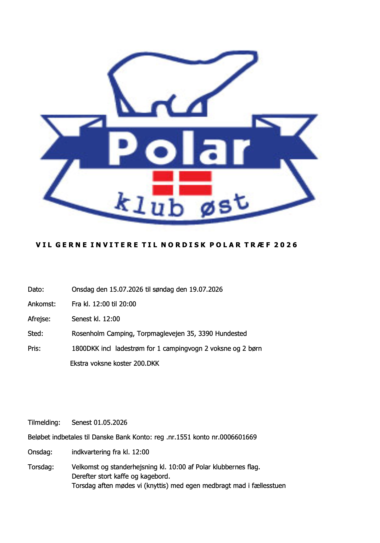 Hej alle,I forbindelse med dette års Nordiske Polar træf i Dorotea, har bestyrelsen fastsat en dato for sidste tilmelding, samt betaling.Sidste frist for tilmelding til årets Polar Træf bliver Fredag den 17.05.2024 -Beløb 1.800,- dkk Oplys ved tilmelding om der skal tages hensyn til mad allergener Klubben tager forbehold for større kursudsving, hvis dette forekommer, kan vi se os nødsaget til at ændre beløbet fra 1.800,- dkkTilmelding foregår til Formand Niels MadsenBetaling foregår til klubkontoen 1551 - 000 660 1669Når vi kender deltagerantallet, kan vi aftale hvor vi mødes, for så at køre samlet de sidste 10-20 km frem til Dorotea.På bestyrelsens vegne,Hilsen Elsebeth